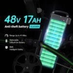 【48V17AH Lithium-ion Battery】: The 48V17AH high-capacity battery offers a range of up to 42 miles, ensuring worry-free travel on your ebike. The battery features a portable design, making it easy to charge on the go.