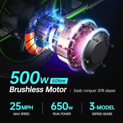 【500W Brushless Motor】:Our electric bike adopts a 500W high speed brushless motor, the highest speed is 25MPH, the powerful motor allows you to conquer the ramp easily!