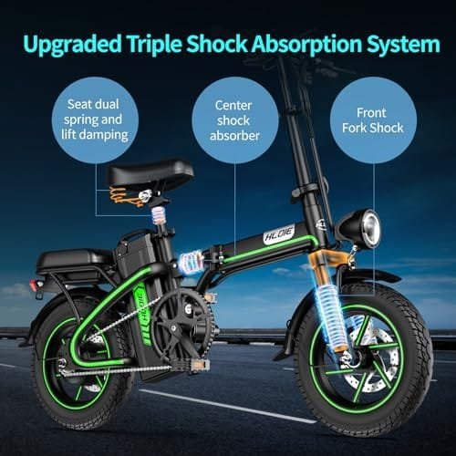 【Quadruple Shock Absorption System and Dual Disc Brakes】:Our ebikes for adults are equipped with a mid-mounted shock absorber, hydraulic shock absorber, dual spring shock absorbers in the seat bag, and lifting spring shock absorbers to provide you with a comfortable riding experience. Additionally, the bike features front and rear dual disc brakes to ensure your riding safety.