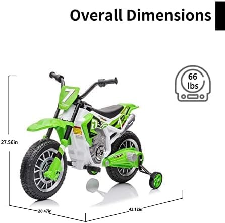 KIDS ELECTRIC DIRT BIKE PRODUCT INFORMATION: Overall Dimensions: 42.12″ L x 20.47″ W x 27.56″ H. Material: kid-friendly PP & Iron. Loading Capacity: 66lb. Recommended Age: 3-6 years old. Certification: CPC, ASTM F963, B.O and CPSIA. It will be the best gift for child's birthday, Christmas, or other festivals.