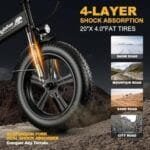 【Dual Shock Absorber System】With an aluminum alloy suspension fork and shock-absorbing seat tube, the folding electric bike for adults can adapt to the changes in terrain and effectively cushion the vibration brought on by a rough road, greatly improving the comfort of riding.