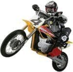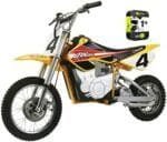 Compact electric motocross bike with powerful 650-watt electric motor Carries riders at speeds of up to 17 mph; authentic dirt bike frame geometry Dual suspension and riser handlebars deliver smooth, comfortable ride Pneumatic knobby tires